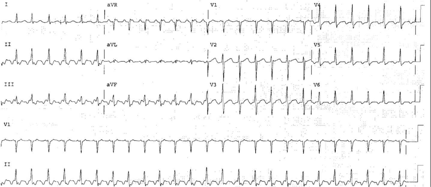 Atrial Flutter with 2:1 Conduction Post category:ECG Interpretations / ECGs Post published:September 26, 2021 Share on Facebook Share on X (Twitter) Share on Pinterest Share on Email Share on Reddit Atrial Flutter with 2:1 Conduction Interpretation QRS Complexes at a rate of 150/minFlutter P waves at a rate of 300/minThe diagnosis is Atrial Flutter with 2:1 Conduction READ MORE about: Summary of ECG Interpretation Share on Facebook Share on X (Twitter) Share on Pinterest Share on Email Share on Reddit Read more articles Previous PostECG Case 28 Next PostECG Case 29 You Might Also Like ECG Case 92: Ventricular tachycardia (VT) July 23, 2022 ECG Case 112 October 22, 2022 ECG Case 72 April 18, 2022