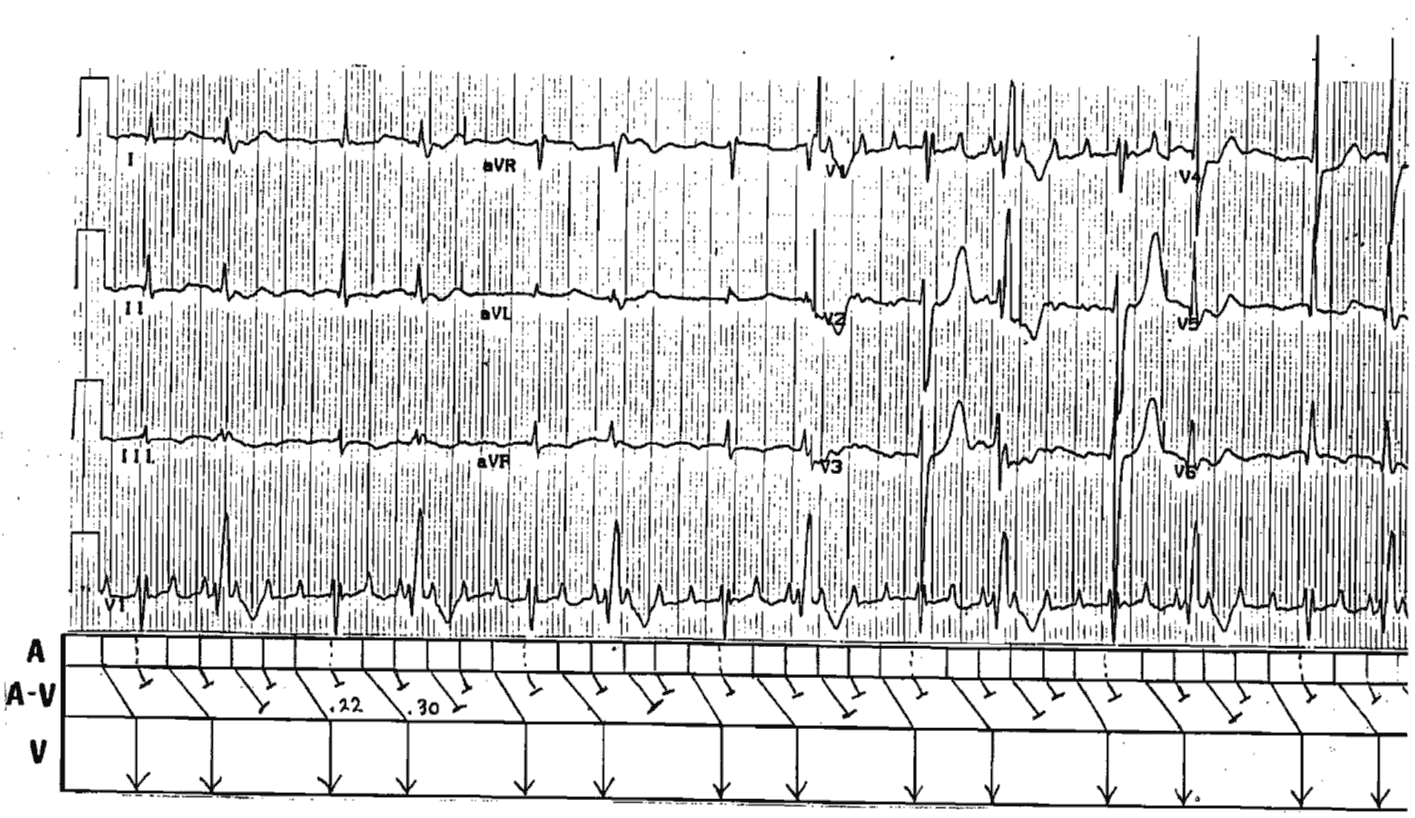 The interesting aspect is the abnormal conduction with RBBB of the second transmitted impulse. The pause due to Wenckebach dropped beat, by the Ashman effect, sets the stage for the aberrant conduction.