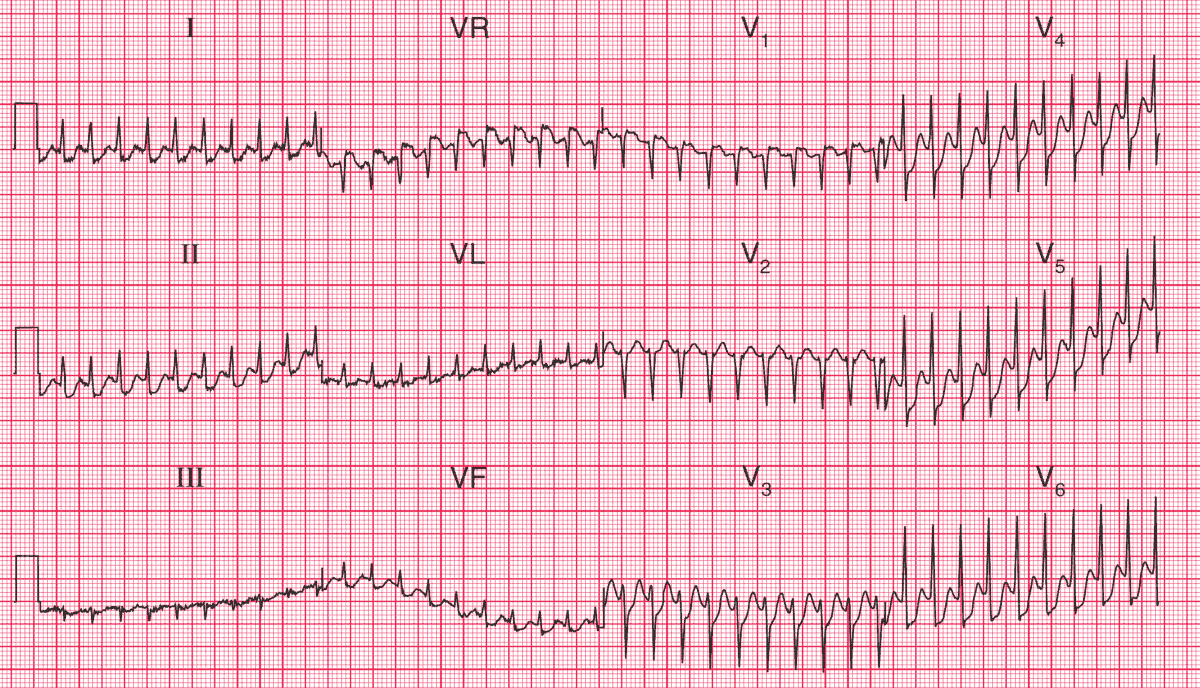 There’s also global ST segment depression with reciprocal ST elevation in leads aVR and V1 indicating subendocardial ischemia caused by supply-demand mismatch probably because of underlying coronary artery disease in this patient.