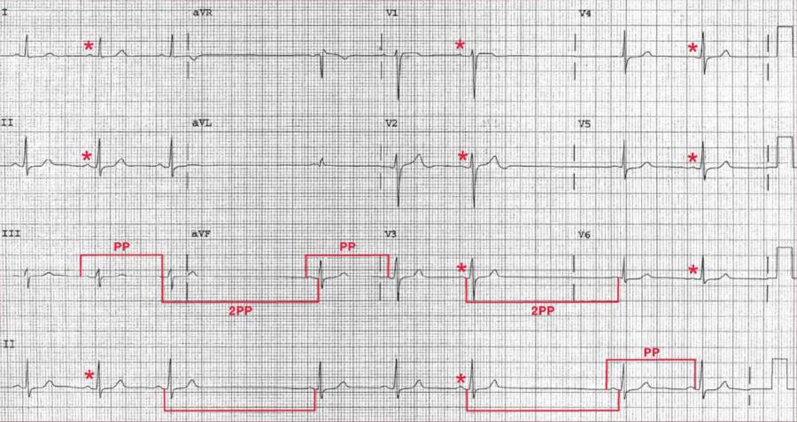 With sinus node exit block, the sinus impulses are regular but there is a failure of one sinus impulse to exit the sinus node area to activate the atria; hence no P wave is present. Since the sinus node impulses are regular, the PP interval around the pauses is equal to two sinus intervals.