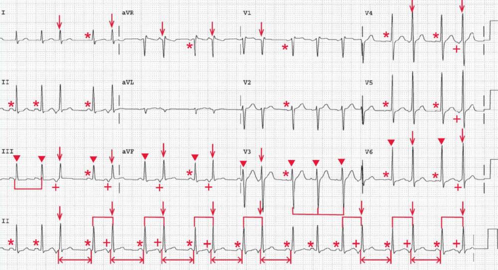 There is an underlying regular rhythm at a rate of 118 bpm (ie, the intermediate intervals). There is a P wave (*) before each of the regular QRS complexes (▼) as well as before the QRS complexes that follow the long RR intervals and are associated with the intermediate RR intervals, and the P wave is positive in leads I, II, aVF, and V5-V6; hence this is sinus tachycardia.