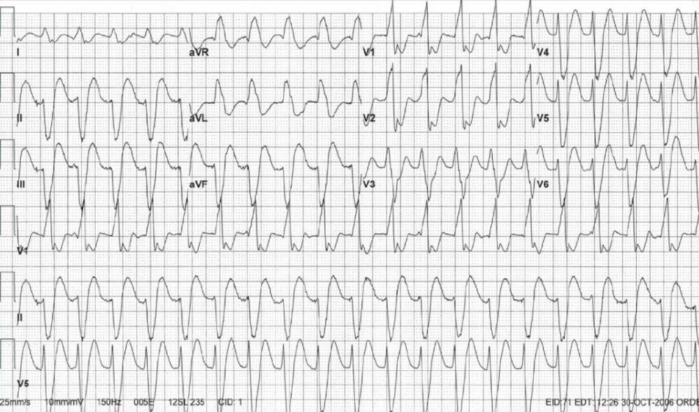 ECG Case 126 Post category:ECGs Post published:December 30, 2022 Share on Facebook Share on X (Twitter) Share on Pinterest Share on Email Share on Reddit ECG Case 126 65-year-old man with known coronary disease presents with lightheadedness and palpitations. What is the rhythm abnormality? CLICK FOR INTERPRETATION AND ANSWER Share on Facebook Share on X (Twitter) Share on Pinterest Share on Email Share on Reddit Read more articles Previous PostECG Case 125 Next PostECG Case 127 You Might Also Like ECG Case 2 – Interpretation April 15, 2021 ECG Case 94: Atrioventricular nodal re-entry tachycardia (AVNRT) with ischaemia July 27, 2022 ECG Case 86 June 14, 2022