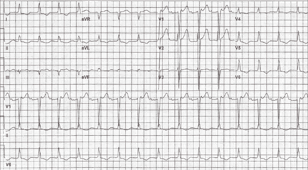 ECG Case 132 Post category:ECGs Post published:January 27, 2023 Share on Facebook Share on X (Twitter) Share on Pinterest Share on Email Share on Reddit ECG Case 132 An 88-year-old man on digoxin presents to his cardiologist for routine follow-up. He is complaining of occasional palpitations and shortness of breath, and an ECG is obtained. What is the arrhythmia? INTERPRETATION AND ANSWER Share on Facebook Share on X (Twitter) Share on Pinterest Share on Email Share on Reddit Read more articles Previous PostECG Case 131 Next PostECG Case 133 You Might Also Like Acute Inferior MI due to Dissection of the Aorta April 6, 2022 ECG Case 27 September 11, 2021 Atrial Flutter with 2:1 Conduction September 26, 2021