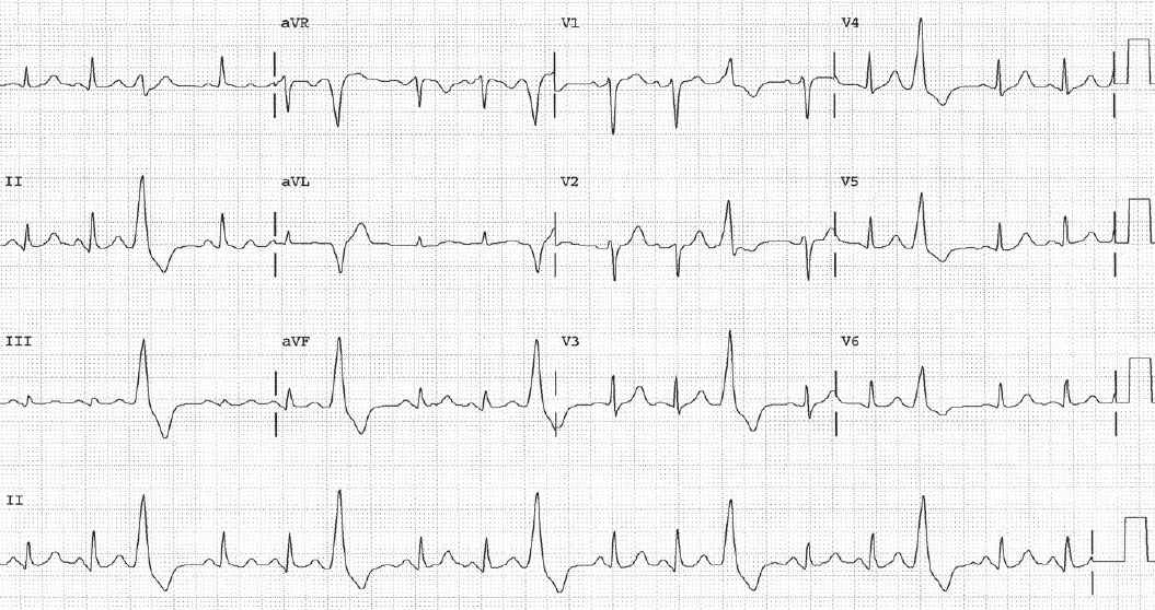 ECG Case 135 Post category:ECGs Post published:February 7, 2023 Share on Facebook Share on X (Twitter) Share on Pinterest Share on Email Share on Reddit ECG Case 135 A patient is noted to have a regularly irregular pulse on exam. An ECG is obtained. What is the rhythm ? INTERPRETATION AND ANSWER Share on Facebook Share on X (Twitter) Share on Pinterest Share on Email Share on Reddit Read more articles Previous PostECG Case 134 Next PostECG Case 136 You Might Also Like ECG Case 35 November 1, 2021 ECG Case 88 June 30, 2022 ECG Case 34 October 24, 2021
