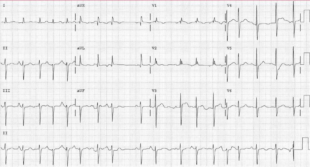 ECG Case 141 Post category:ECGs Post published:February 28, 2023 Share on Facebook Share on X (Twitter) Share on Pinterest Share on Email Share on Reddit ECG Case 141 A 36-year-old woman with primary pulmonary hypertension is seen in her physician’s office after initiation of pulmonary vasodilator therapy. She is found to be tachycardic with an irregularly irregular heart rate. What does her ECG show? INTERPRETATION AND ANSWER Share on Facebook Share on X (Twitter) Share on Pinterest Share on Email Share on Reddit Read more articles Previous PostECG Case 140 Next PostECG Case 142 You Might Also Like Atrial Flutter with 1:1 conduction then 2:1 conduction November 1, 2021 ECG Case 19 July 31, 2021 ECG Case 87: WPW syndrome type A June 27, 2022