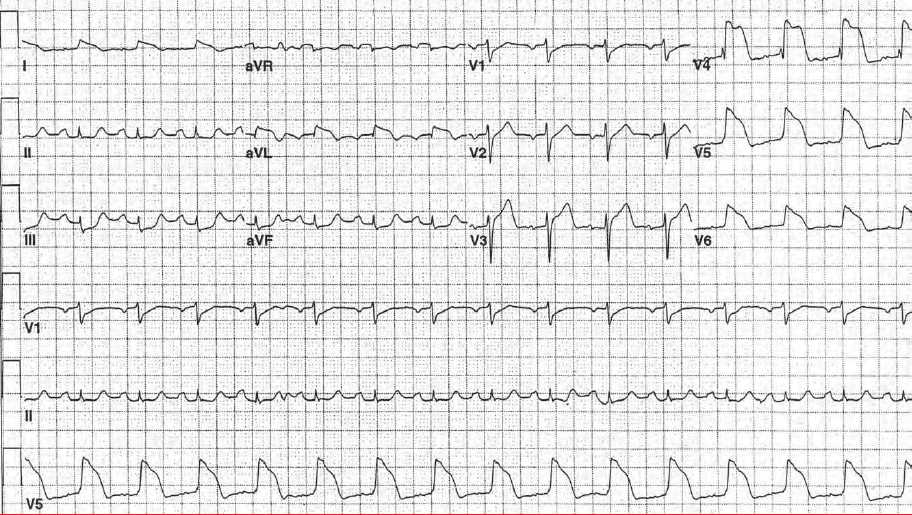 A 34-year-old woman presents with crushing retrosternal chest pain occurring at rest. She has no prior medical history, although she had an uneventful term pregnancy and delivery 3 weeks prior. The pain is unrelenting and associated with mild dyspnea. Upon arrival to the emergency department, an ECG is obtained.