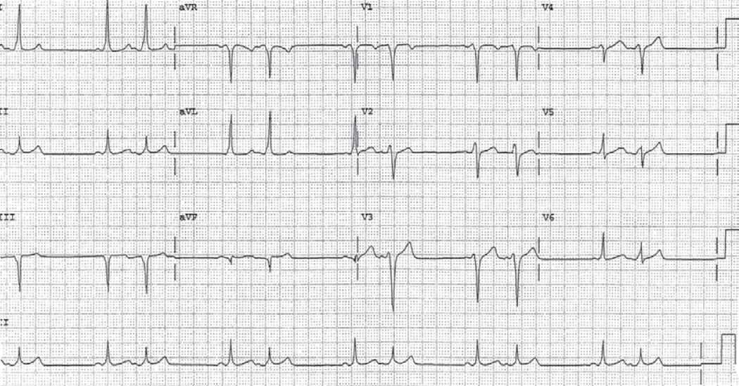 A 24-year-old man presents to his primary physician with complaints of intermittent palpitations. He has noted these symptoms on and off for a year. They occur and remit spontaneously and can last for minutes up to an hour at a time. He denies syncope. He is otherwise healthy and a general review of symptoms is unremarkable. The physician obtains an ECG.