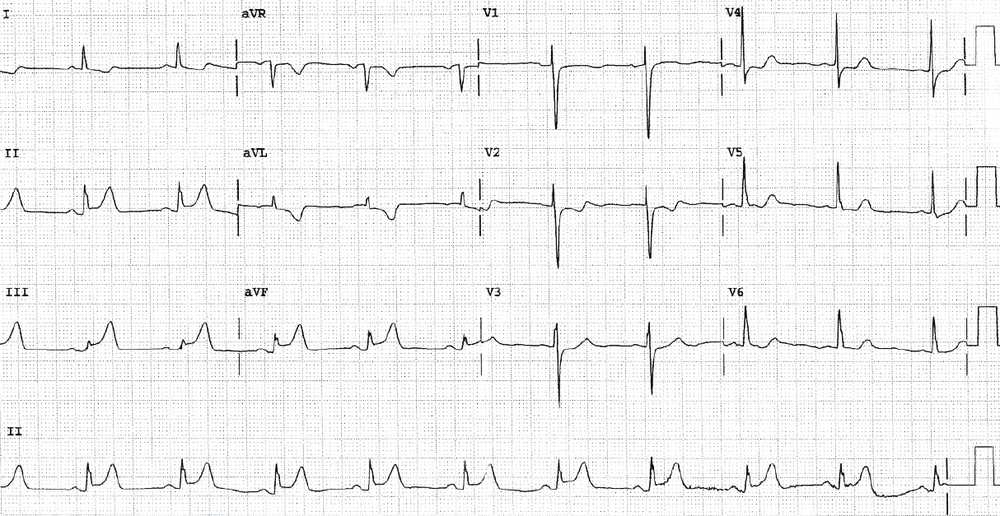 A 54-year-old man develops epigastric discomfort and nausea while driving home from his job as a night watchman. The sensation does not abate and when he arrives home he begins to feel diaphoretic and the chest and epigastric pain intensify. He calls emergency medical services, who obtain an ECG immediately upon arrival.