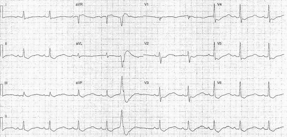 ECG Case 201 Post category:ECGs Post published:March 13, 2024 Share on Facebook Share on X (Twitter) Share on Pinterest Share on Email Share on Reddit This ECG is from a 57-year-old female complaining of weakness. ECG Case 201 What abnormalities are present on this ECG ? INTERPRETATION AND ANSWER Share on Facebook Share on X (Twitter) Share on Pinterest Share on Email Share on Reddit Read more articles Previous PostECG Case 200 Next PostECG Case 202 You Might Also Like ECG Case 85 June 7, 2022 Atrial Flutter 2:1 Conduction July 5, 2021 ECG Case 25 September 5, 2021
