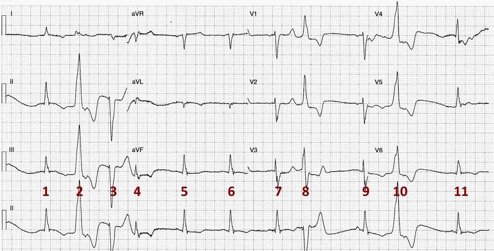 A 72-year-old male with nausea, lethargy, and anorexia the preceding week. Past medical history is positive for chronic renal failure, and ischaemic heart disease with previous 2 vessel PCI. Medications included frusemide, ACE-inhibitor, and a statin. Serum potassium levels were normal.