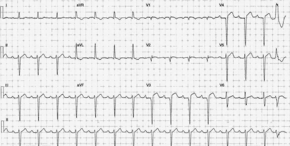 This ECG is from a 70-year-old patient with a history of ischaemic heart disease complicated by ischaemic cardiomyopathy (LV ejection fraction of 27%). The patient presented with worsening dysponea without chest pain.