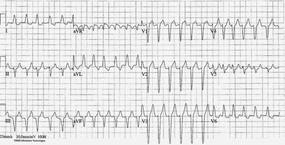 ECG Case 238 Post category:ECGs Post published:October 2, 2024 Share on Facebook Share on X (Twitter) Share on Pinterest Share on Email Share on Reddit ECG Case 238 This ECG is from a 75-year-old female. We don’t have any other clinical information on this case unfortunately. What are your thoughts on the rhythm ? INTERPRETATION Share on Facebook Share on X (Twitter) Share on Pinterest Share on Email Share on Reddit Read more articles Previous PostECG Case 237 Next PostECG Case 239 You Might Also Like Conduction Blocks at the AV Node (AV Blocks) [With Examples] May 13, 2021 ECG Case 89 July 6, 2022 Left Ventricular Hypertrophy (LVH): How to Recognize it on ECG [With Examples] January 31, 2022