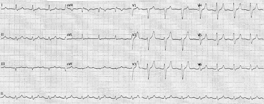 ECG Case 239 Post category:ECGs Post published:October 15, 2024 Share on Facebook Share on X (Twitter) Share on Pinterest Share on Email Share on Reddit ECG Case 239 This week’s ECG is from a 60-year-old male who presented with 3 days of vomiting and diarrhoea. Past medical history of hypertension and mild chronic renal impairment. What’s your interpretation ? INTERPRETATION AND ANSWER Share on Facebook Share on X (Twitter) Share on Pinterest Share on Email Share on Reddit Read more articles Previous PostECG Case 238 Next PostECG Case 240 You Might Also Like ECG Case 85 June 7, 2022 Hypokalemia as a result of Anorexia Nervosa and Diarrhea September 21, 2021 ECG Case 46 December 20, 2021