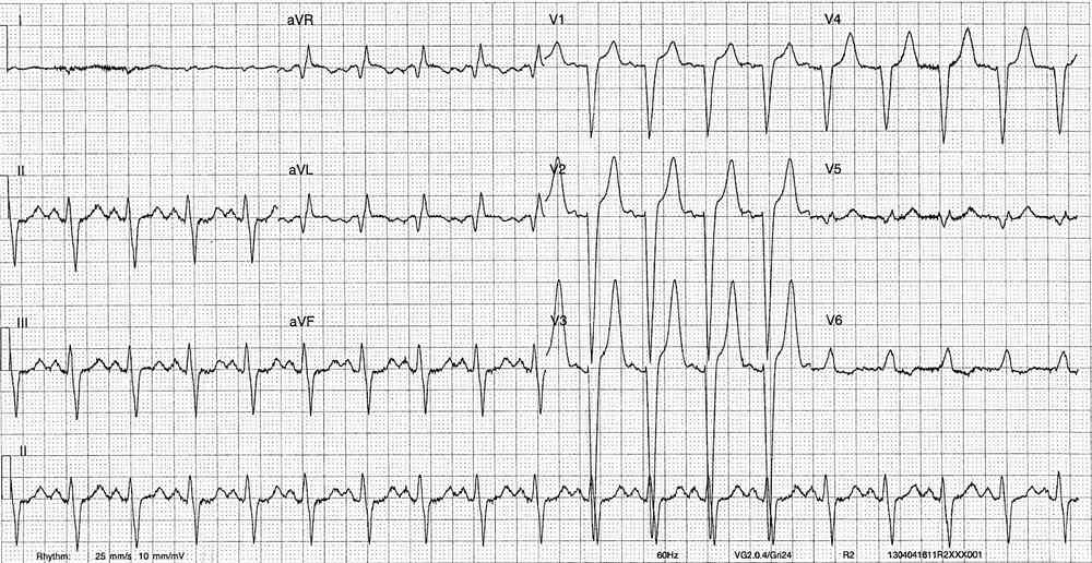 ECG Case 251 Post category:ECGs Post published:December 21, 2024 Share on Facebook Share on X (Twitter) Share on Pinterest Share on Email Share on Reddit ECG Case 251 This ECG is from a 70-year-old male who presented to the Emergency Department following an overdose of unknown agent/agents. Vital signs on arrival: GCS 8 (V=1 E=2 M=5) BP 103/67 Temp 36.4 C (97.5 F) Glucose 5.8 mmol/L What’s your interpretation ? INTERPRETATION AND ANSWER Share on Facebook Share on X (Twitter) Share on Pinterest Share on Email Share on Reddit Read more articles Previous PostECG Case 250 Next PostECG Case 252 You Might Also Like ECG Case 93: Sick Sinus Syndrome July 24, 2022 Old Inferior MI November 28, 2021 Cancer Associated Hypercalcemia May 18, 2021
