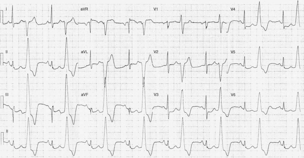 This ECG is from a 73-year-old male who presented to the Emergency Department complaining of 10 hours of chest pain, sore throat, cough and dysponea. He has an AICD in situ and known cardiomyopathy (EF 25%). Vital signs were within normal limits.