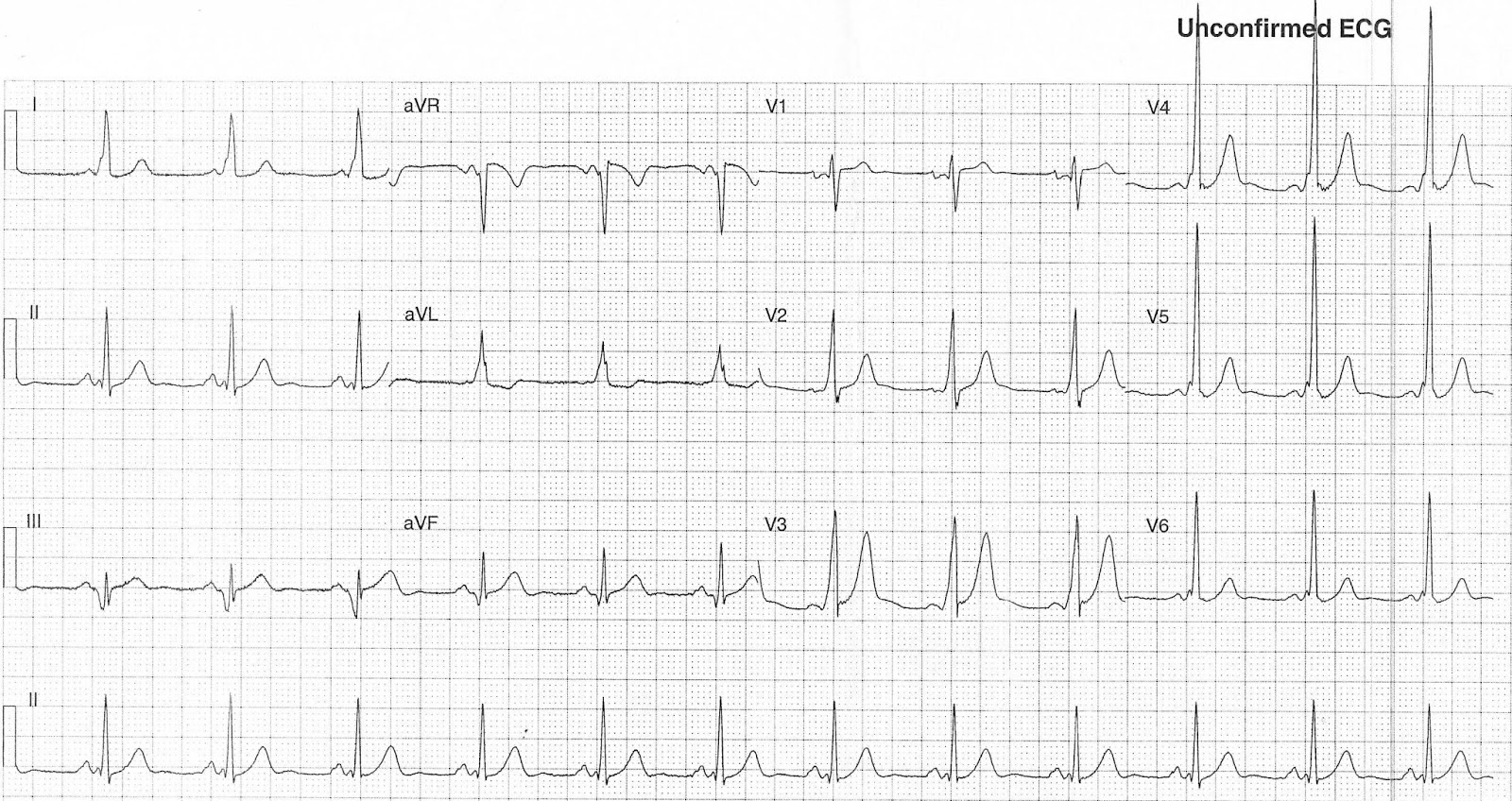 ECG Case 262 Post category:ECGs Post published:March 4, 2025 Share on Facebook Share on X (Twitter) Share on Pinterest Share on Email Share on Reddit ECG Case 262 This ECG is from a 36-year-old male who presented to the Emergency Department with 8 hours of right sided chest pain. What’s your interpretation ? INTERPRETATION AND ANSWER Share on Facebook Share on X (Twitter) Share on Pinterest Share on Email Share on Reddit Read more articles Previous PostECG Case 261 Next PostECG Case 263 You Might Also Like ECG Case 51: Left Anterior Fascicular Block (LAFB) and Left Ventricular Hypertrophy January 8, 2022 ECG Case 73 April 20, 2022 ECG Case 62: Pulmonary Embolism February 24, 2022