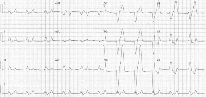 ECG Case 275 Post category:ECGs Post published:May 24, 2025 Share on Facebook Share on X (Twitter) Share on Pinterest Share on Email Share on Reddit ECG Case 275 This ECG is from a 75-year-old male who presented complaining of lethargy, nausea and shortness of breath. What is your interpretation ? INTERPRETATION AND ANSWER Share on Facebook Share on X (Twitter) Share on Pinterest Share on Email Share on Reddit Read more articles Previous PostECG Case 274 Next PostECG Case 276 You Might Also Like ECG Case 14 June 18, 2021 ECG Case 71: Atrial fibrillation with RVR, LAFB and Acute Anterolateral STEMI April 13, 2022 Know the Differential for ST Segment Elevation: It’s More Than Just ACS October 15, 2021