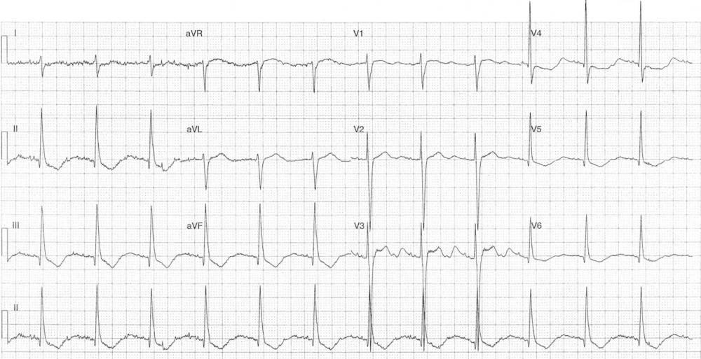 ECG Case 294 Post category:ECGs Post published:September 13, 2025 Share on Facebook Share on X (Twitter) Share on Pinterest Share on Email Share on Reddit ECG Case 294 The ECG is from an elderly female who presented with malaise, weight loss and chest pain. What’s your interpretation ? INTERPRETATION AND ANSWER Share on Facebook Share on X (Twitter) Share on Pinterest Share on Email Share on Reddit Read more articles Previous PostECG Case 293 Next PostECG Case 295 You Might Also Like ECG Case 105 September 12, 2022 LBBB and Atrial Flutter with 2:1 and 3:2 Conduction September 9, 2021 ECG Case 78: Ventricular tachycardia in a 60-year-old man May 11, 2022