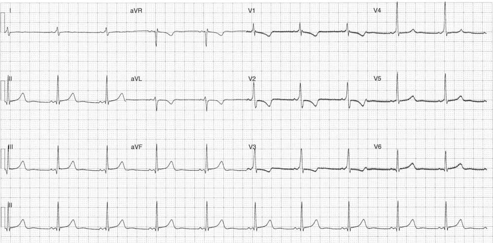 ECG Case 299 Post category:ECGs Post published:October 18, 2025 Share on Facebook Share on X (Twitter) Share on Pinterest Share on Email Share on Reddit ECG Case 299 This ECG is from a 20-year-old female who presented following an episode of palpitations associated with chest pain and dyspnea. What’s your interpretation ? INTERPRETATION AND ANSWER Share on Facebook Share on X (Twitter) Share on Pinterest Share on Email Share on Reddit Read more articles Previous PostECG Case 298 Next PostECG Case 300 You Might Also Like ECG Case 43 December 9, 2021 LBBB and Atrial Flutter with 2:1 and 3:2 Conduction September 9, 2021 ECG Case 5 Interpretation – Chronic Obstructive Pulmonary Disease (COPD) April 23, 2021