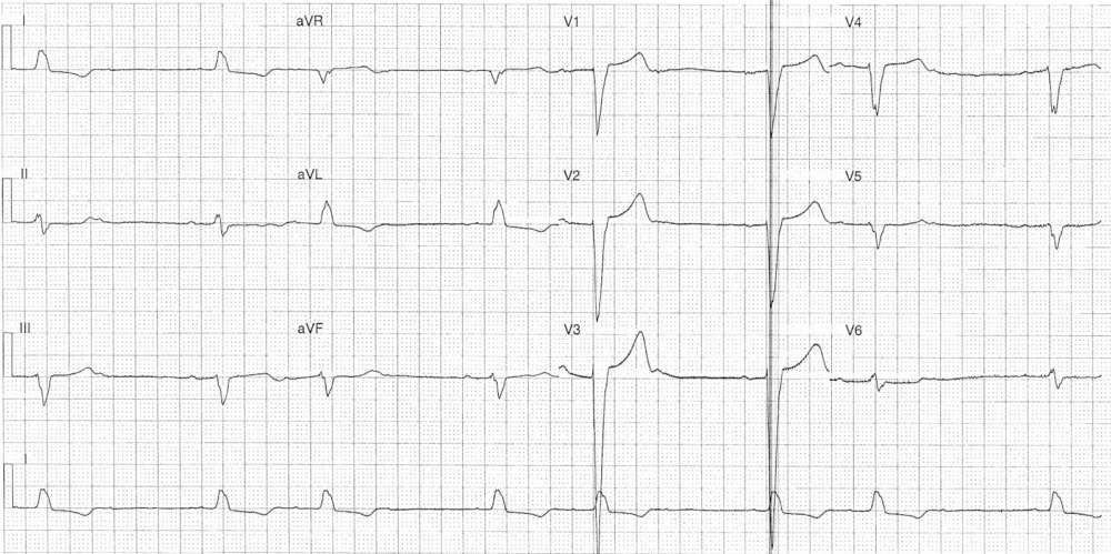 ECG Case 302 Post category:ECGs Post published:November 7, 2025 Share on Facebook Share on X (Twitter) Share on Pinterest Share on Email Share on Reddit ECG Case 302 This ECG is from an 88-year-old male with a history of ischemic heart disease and PVD. I don’t know what his presenting complaint to the Emergency Department was. What’s your interpretation, what’s the rhythm ? INTERPRETATION AND ANSWER Share on Facebook Share on X (Twitter) Share on Pinterest Share on Email Share on Reddit Read more articles Previous PostECG Case 301 Next PostECG Case 303 You Might Also Like Hypercalcemia and Atrial Flutter with 3:1 Conduction November 6, 2021 ECG Case 39 November 20, 2021 ECG Case 30 October 1, 2021