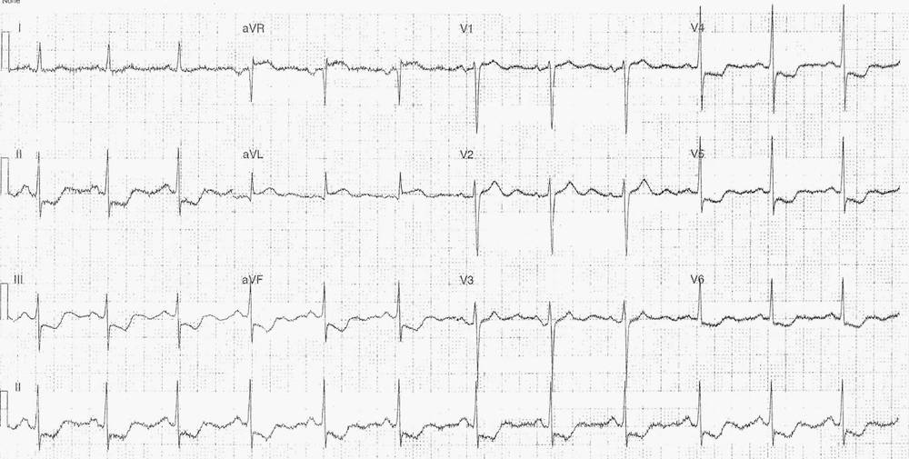 This ECG is from a 63-year-old male who presented with chest pain. He has a 1 month history of exertional chest pain and continuous chest pain for the last 3 hours. He is a hypertensive, ex-smoker with a positive cardiac family history.