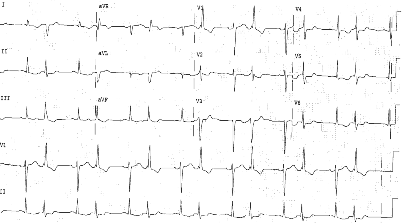 ECG Case 38 Post category:ECGs Post published:November 18, 2021 Share on Facebook Share on X (Twitter) Share on Pinterest Share on Email Share on Reddit 66-year-old woman presented with palpitations. What’s the rhythm ? CLICK HERE FOR INTERPRETATION AND ANSWER Share on Facebook Share on X (Twitter) Share on Pinterest Share on Email Share on Reddit Read more articles Previous PostECG Case 37 Next PostECG Case 39 You Might Also Like ECG Case 95 July 30, 2022 Atrial Fibrillation with Rate Related RBBB May 5, 2021 ECG Case 78: Ventricular tachycardia in a 60-year-old man May 11, 2022