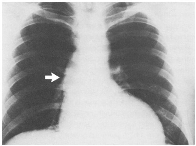 This is the classic ECG appearance of left ventricular hypertrophy. The chest X-ray showed an enlarged left ventricle with ‘post-stenotic’ dilatation of the ascending aorta (arrowed).