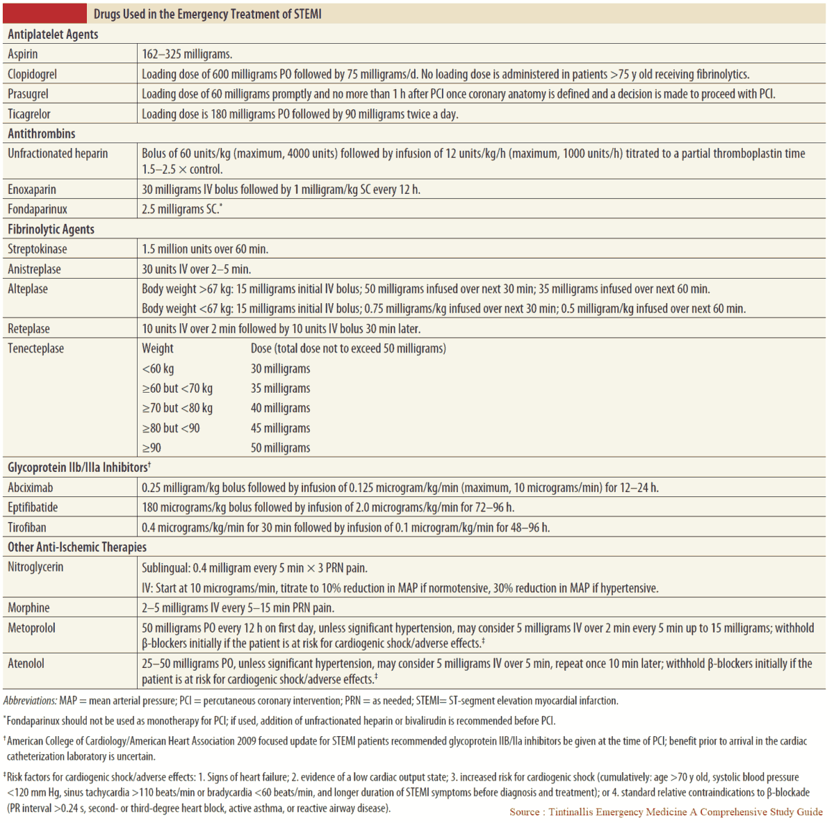 The drugs used in the treatment of Acute STEMI are summarized in the table below.