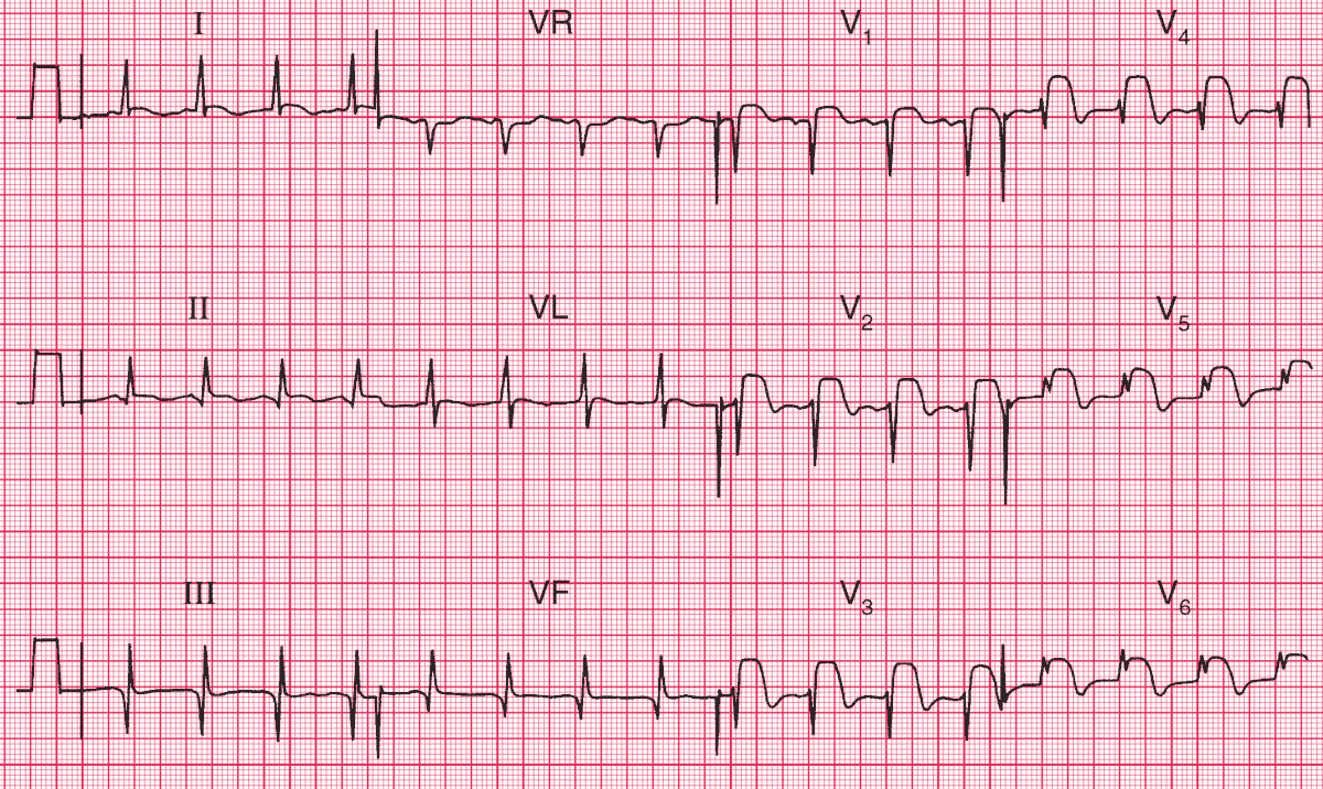 - Marked ST segment elevation in leads V1–V6 (Tombstone ST elevation)