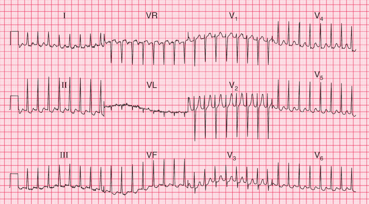This ECG shows supraventricular tachycardia. This rhythm is usually due to a re-entry pathway within, or near to, the atrioventricular node, so the rhythm is properly called AV nodal re-entry tachycardia (AVNRT), although the term ‘supraventricular tachycardia’ is often (inappropriately) used.