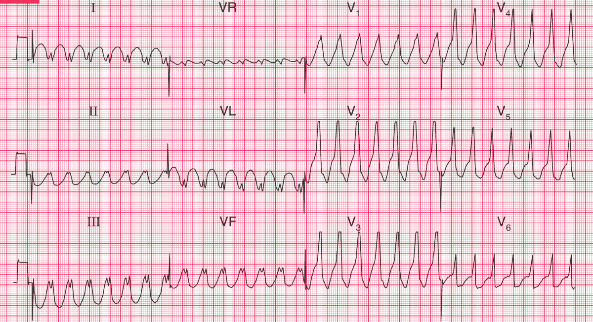 A 60-year-old man complained of severe central chest pain, and a few minutes later became extremely breathless and collapsed. He was brought to the A & E department, where his heart rate was found to be 165/min, his blood pressure was unrecordable and he had signs of left ventricular failure.