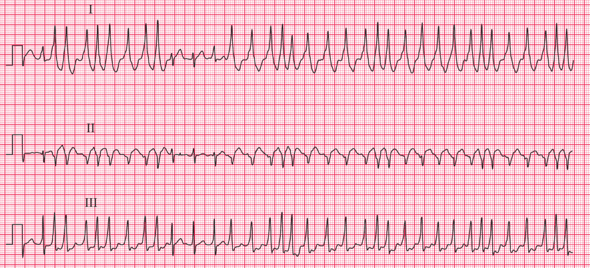 - A very irregular tachycardia with a ventricular rate of up to 200/min