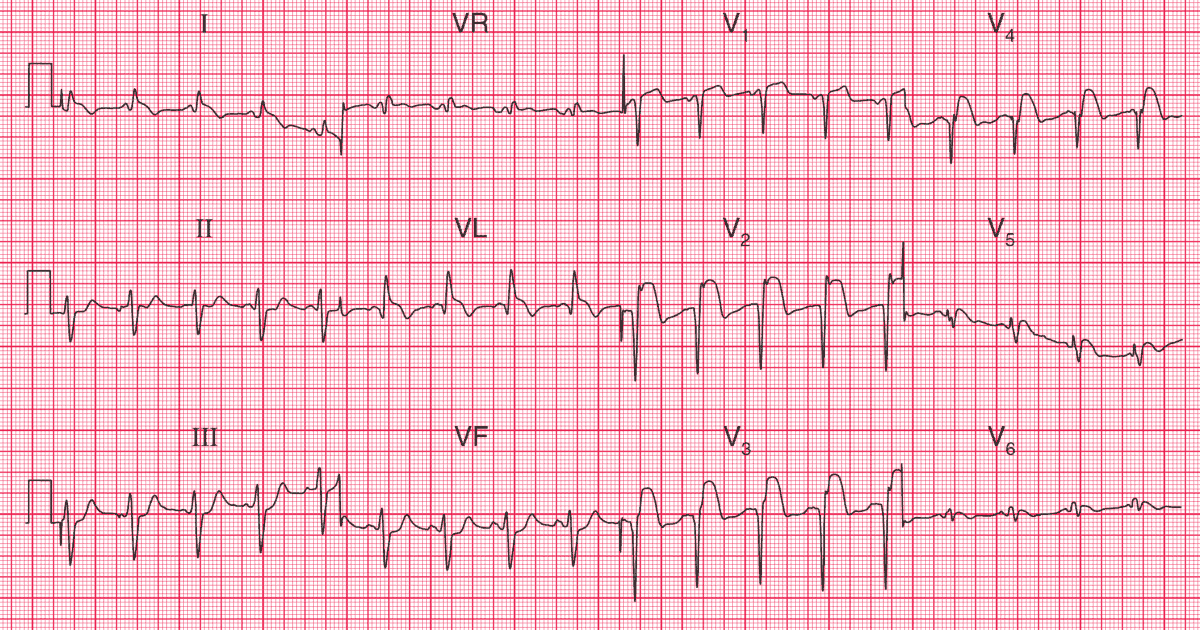 - Raised ST segments in leads I, aVL, V1–V6
