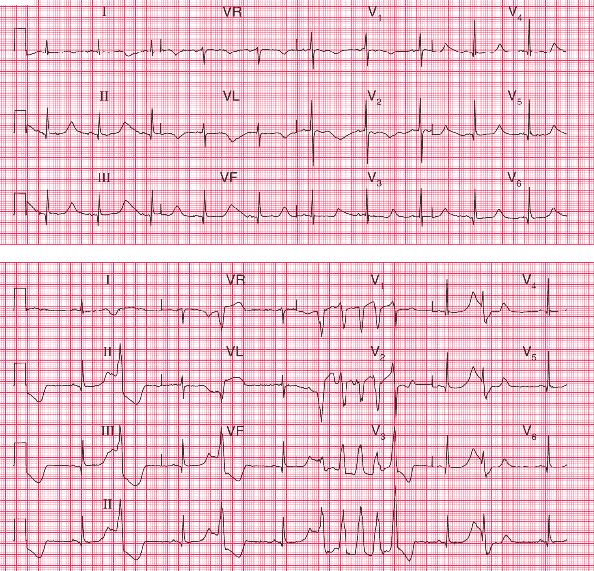 The upper ECG shows: