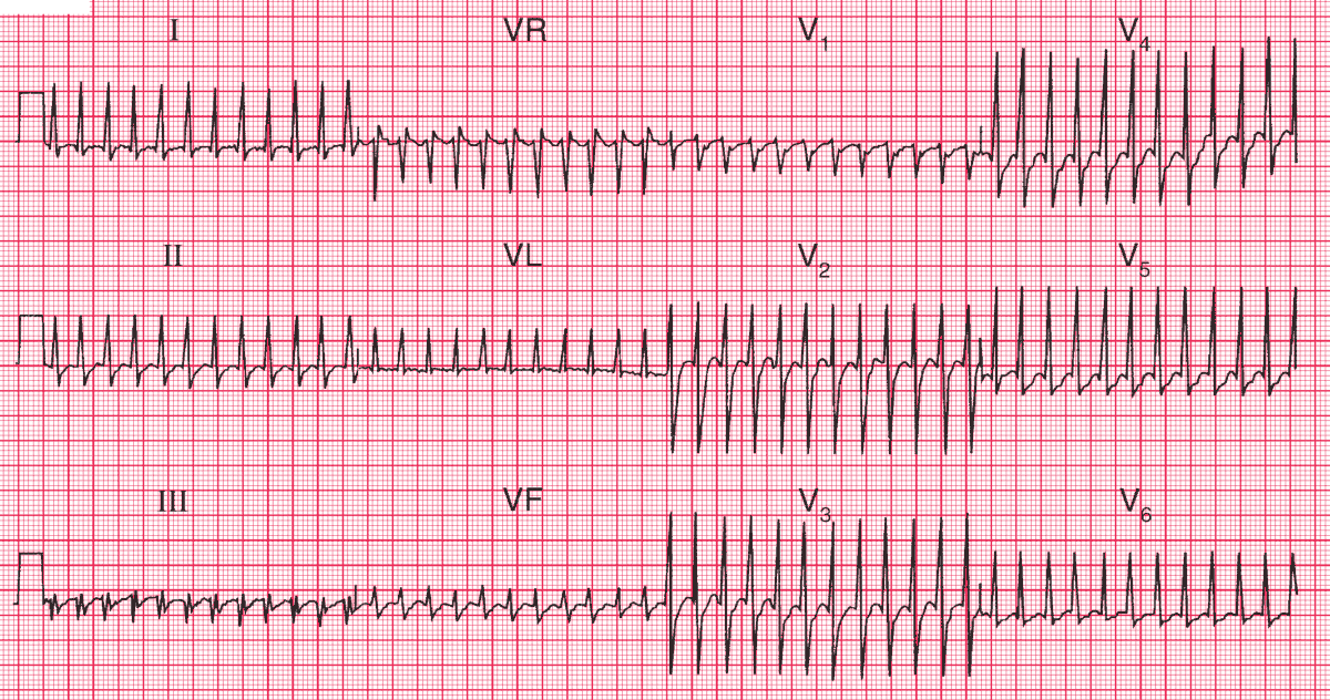 A regular narrow complex tachycardia at 300/min probably represents atrial flutter with 1 : 1 conduction (i.e. each atrial activation causes ventricular activation).