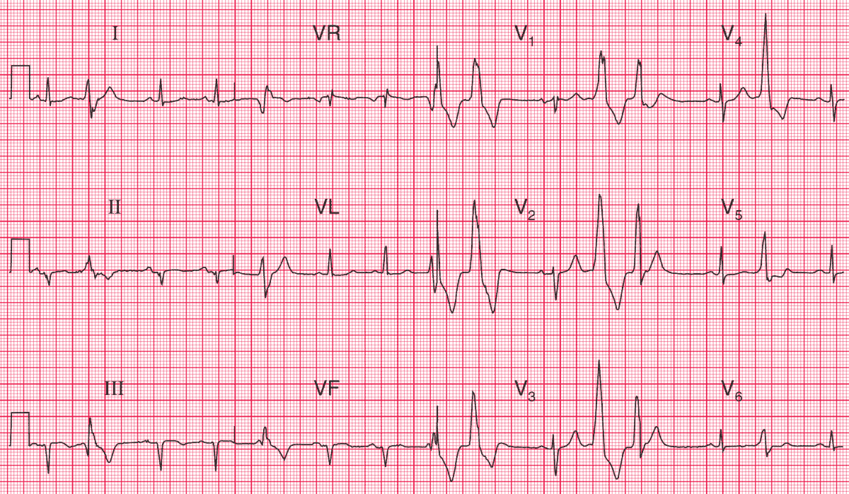 - Sinus rhythm, rate 88/min, with frequent multifocal ventricular extrasystoles