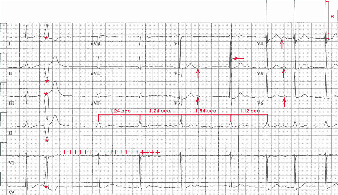 In addition, prominent U waves are seen in leads V2-V6 (↑). It is often seen as a low-amplitude, positive waveform in the right precordial leads (V1-V3) and it often becomes more prominent with bradycardia.