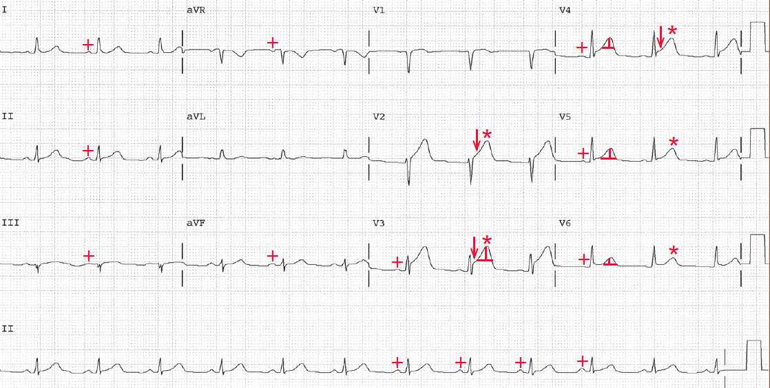 There is ST-segment elevation (↓) in leads V2-V4, and the T waves are big and symmetric (*) (hyperacute T waves). This is thus an acute anterior wall myocardial infarction.