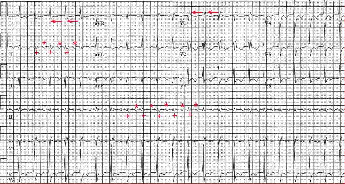 Negative atrial waveforms can be seen in leads II and aVF (*). A second atrial waveform (+) is seen at the end of the QRS complex, particularly in lead II. Although it looks like an S wave, it has the same morphology as the atrial waveform that is seen before the QRS complex and the interval between the two atrial waveforms is the same and stable, at a rate of 280 bpm.