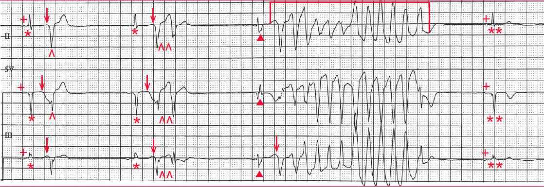 There is a third narrow QRS complex (▲), which is again followed by an R-on-T PVC (↓). However, this PVC provokes a brief episode of polymorphic ventricular tachycardia (┌┐). This tachycardia has QRS complexes that are changing in morphology and axis. Because it is self-terminating, this is termed nonsustained polymorphic ventricular tachycardia.