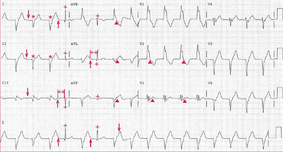 In addition, there are subtle differences in QRS complex morphology (*), especially obvious in leads I and II. These findings indicate AV dissociation, and the narrow sinus complexes (+) represent intermittent capture or Dressler complexes.