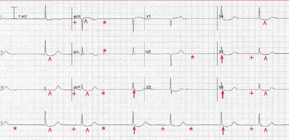 The second, fourth, and sixth complexes are associated with a stable PR interval (0.26 sec). Following the second and fourth QRS complexes, there is an on-time but nonconducted P wave (*), ie, there is no QRS complex associated with them. Therefore, this is a second-degree AV block.