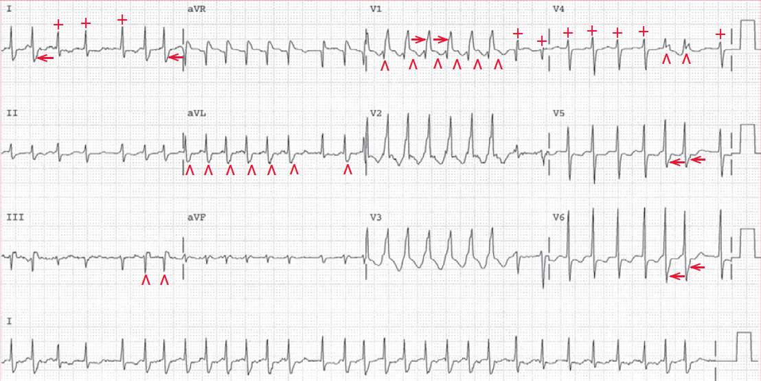 The narrow complexes (+) have a duration of 0.08 second and have a normal morphology. The wide QRS complexes (^) have a duration of 0.12 second and these QRS complexes have a right bundle branch block morphology (RSR′ in V1 [→] and broad S wave in leads I and V5–V6 [←]).