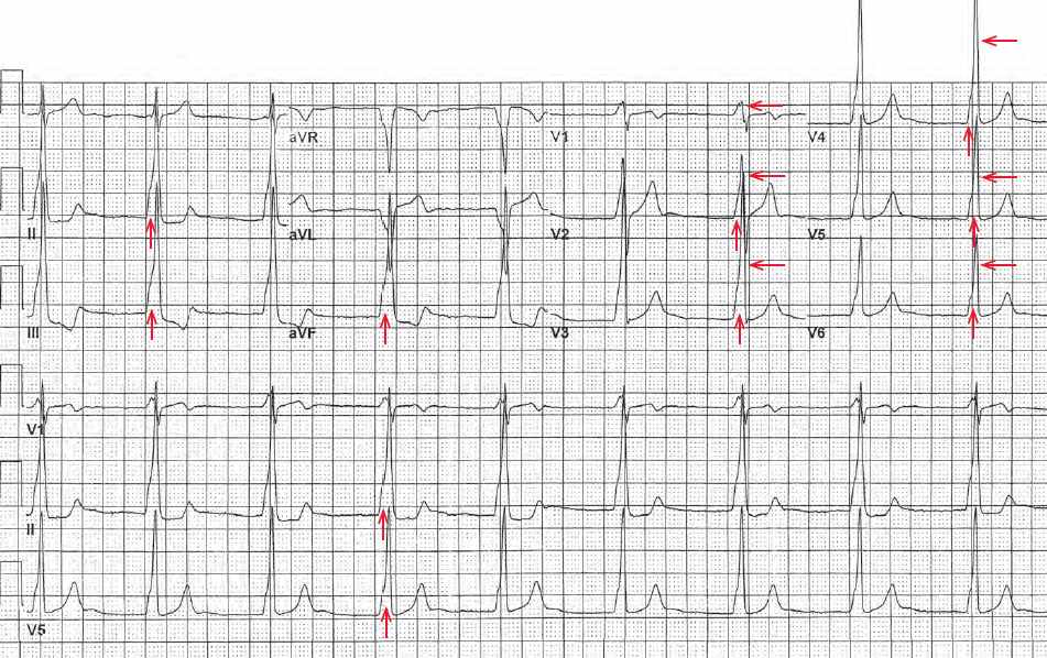 Noted is positive concordance, ie, tall R waves across the precordium from V1–V6 (←). The QRS complex duration and morphology are consistent with either a ventricular complex or a Wolff-Parkinson-White (WPW) pattern. However, the absence of P wave makes WPW a less likely diagnosis.