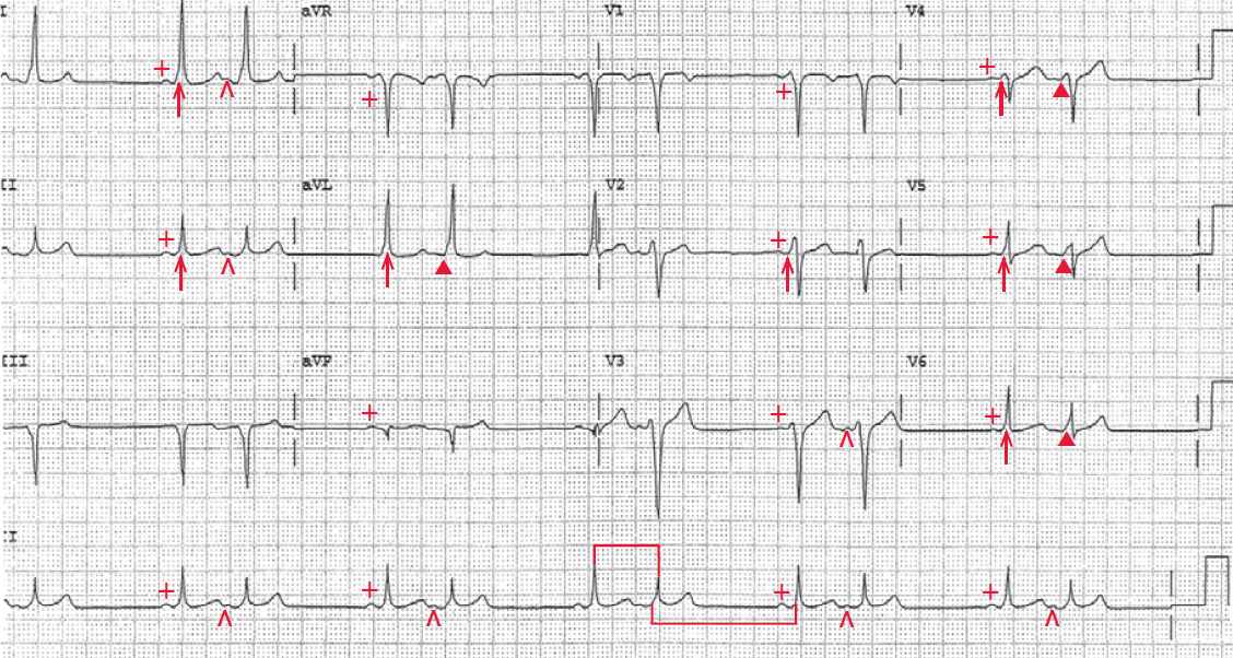 The PR interval of each of these premature complexes is short and the same as the sinus complexes (0.10 sec) and the QRS complex has a delta wave (▲). However, the QRS complex duration is slightly longer than the sinus complex (0.14 sec) and the delta wave is more prominent, most obviously in leads V4–V6.