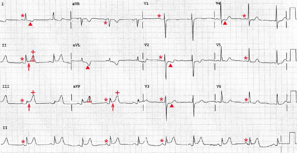 There is a regular rhythm at a rate of 60 bpm. There is a P wave (*) before each QRS complex with a stable PR interval (0.16 sec). The P wave is positive in leads I, II, aVF, and V4-V6 and negative in lead aVR.