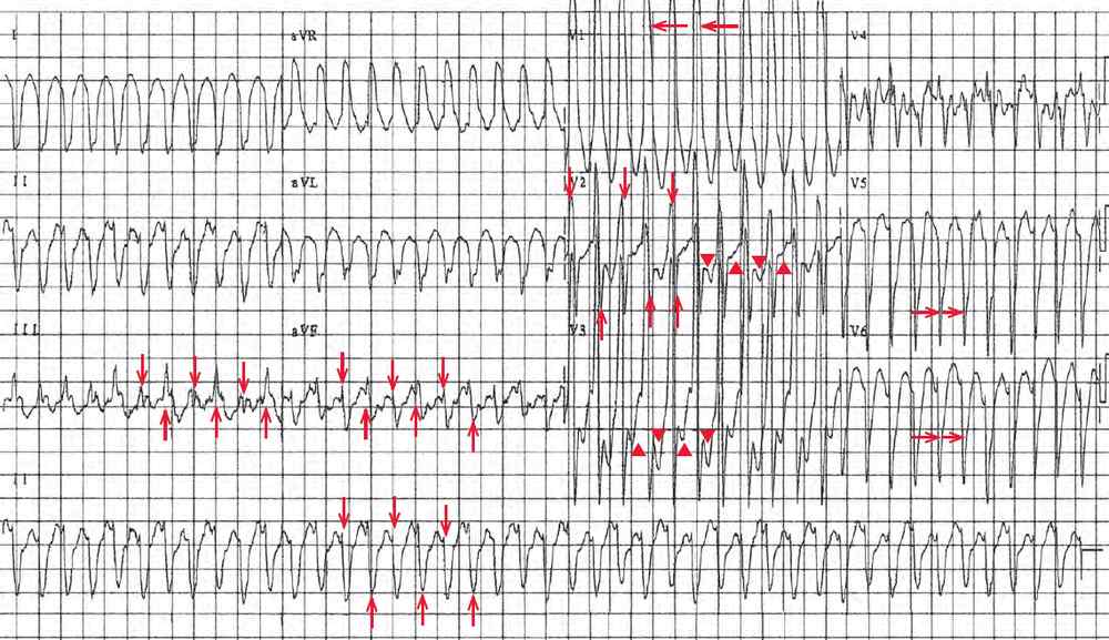 The QRS complex morphology is unusual with a tall R wave in lead V1 (←), but a small R wave and deep S waves in leads V5–V6 (→). While the morphology resembles a right bundle branch block (RBBB), it is not typical. Hence this is a wide QRS complex tachycardia.