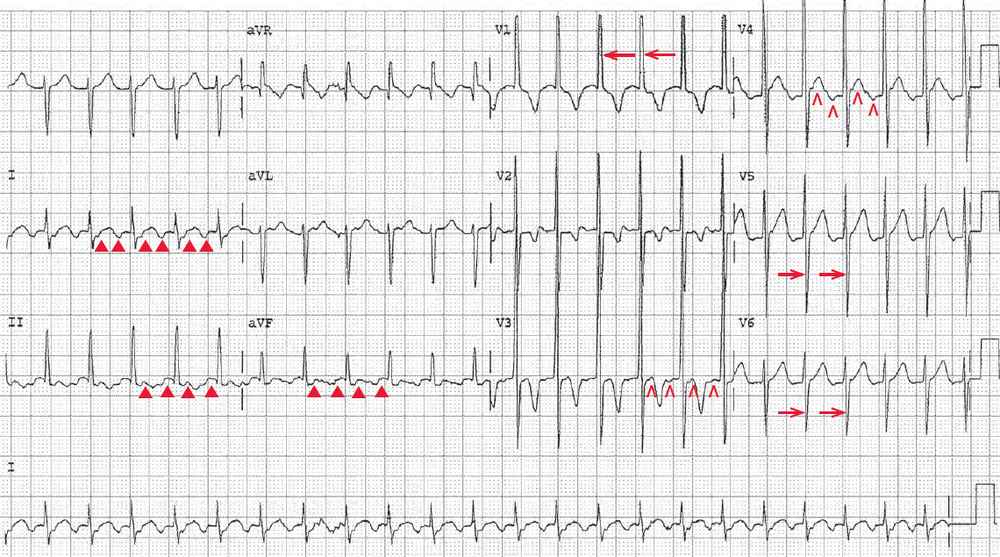 There is a regular rhythm with a rate of 140 bpm. Although there are no distinct P waves, there are typical atrial flutter waves (at a rate of 280 bpm) seen, primarily in leads II, III, and aVF (▲). They may also be seen in leads V3–V4 (^). Hence this rhythm is atrial flutter with 2:1 AV block. The atrial rate is identical to the ventricular rate in the previous ECG, confirming that this was indeed atrial flutter with 1:1 AV conduction.