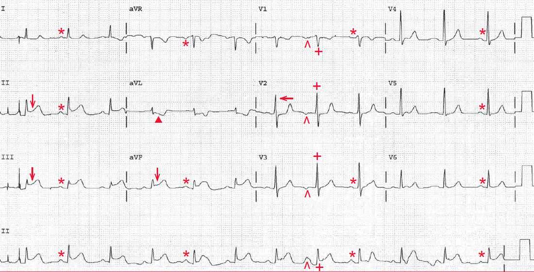 The eighth QRS complex is early (+) and the P wave before it (^) has a different morphology (ie, it is negative in leads V1-V3) compared with the other P waves. This is a premature atrial complex.
