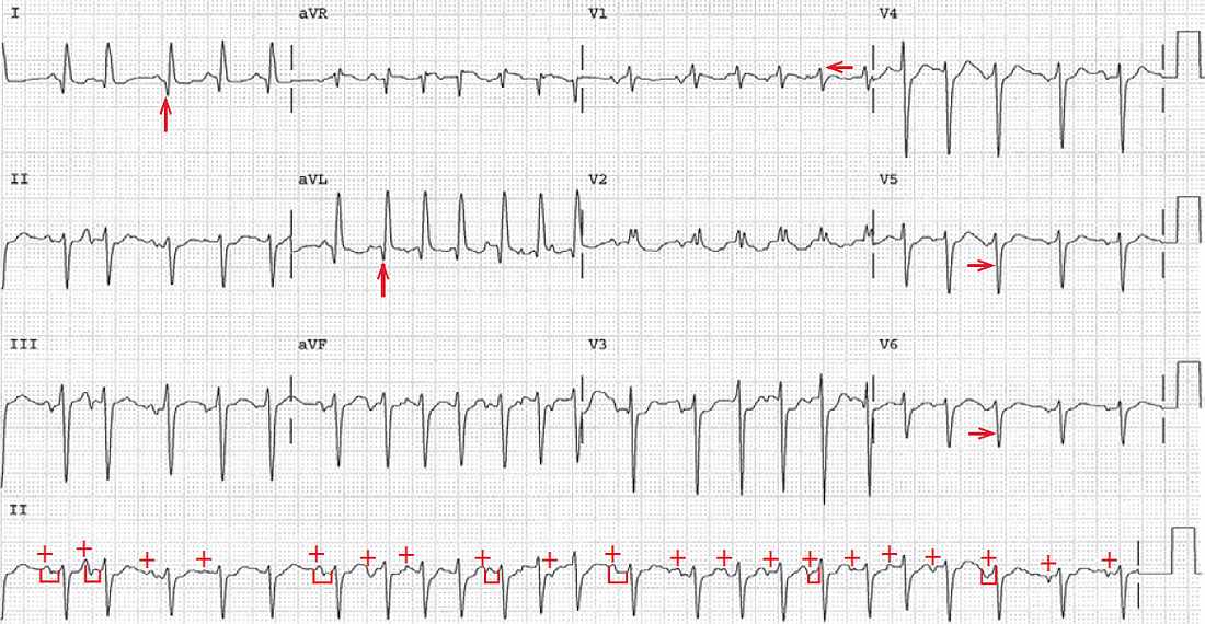 In this ECG, there are P waves (+) seen before each QRS complex with variable or nonconsistent PR intervals (└┘). In addition, the P-wave morphology is variable, with > 3 different morphologies seen. These features (irregularly irregular rhythm at a rate > 100, variable P-wave morphologies and variable PR intervals) are the features of a multifocal atrial tachycardia.
